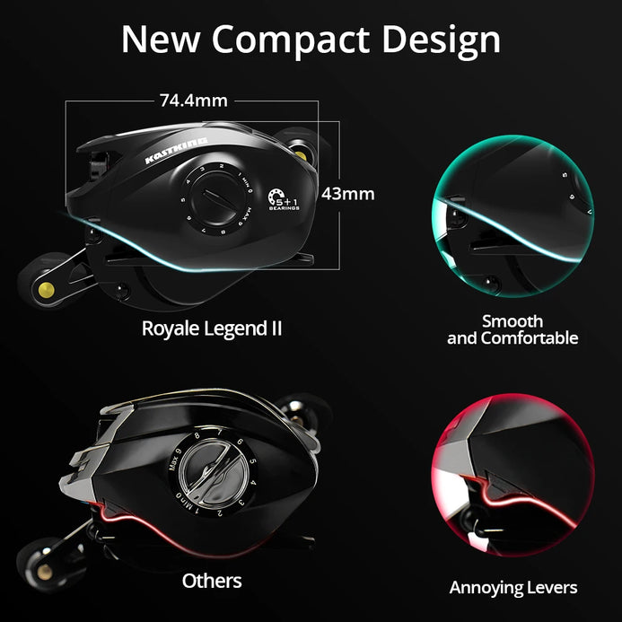 NEW COMPACT DESIGN - Royale Legend II Baitcasting Reels are totally redesigned for comfort and super performance! It’s a compact size low profile baitcaster fishing reel combined with a concealed side cover release that makes the reel comfortable even after thousands of casts during a day of fishing.
