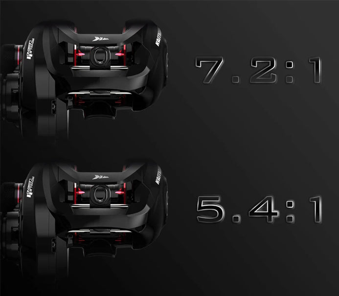 FASTER AND LIGHTER - Royale Legend II provides faster gear ratios than the previous models. The new 5.4:1 gear ratio model is perfect for crankbaits or slower presentations, while the 7.2:1 gear ratio model that quickly picks up fishing line at 26.8” per turn is great for pitching jigs or burning baits at high speed. Compact design also saves weights for Royale Legend II, making it just 204g, which is lighter than most of graphite side covers and frame casting reels available today.