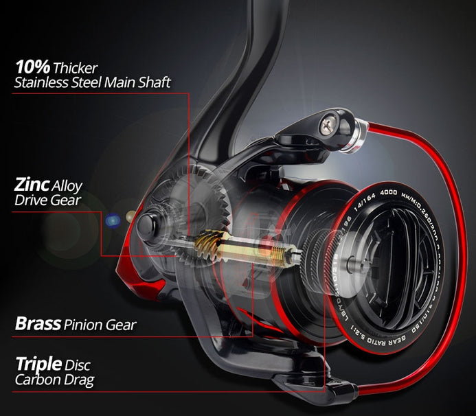 The all NEW KastKing Sharky III spinning fishing reel is now lighter, smoother, and stronger! This KastKing Sharky III spinning reel with its amazing high efficiency triple disc carbon fiber drag to 39.5 lbs, 10 + 1 shielded stainless steel bearings, braid fishing line ready aluminum spool, precision manganese brass alloy gear, fiber reinforced body, and an oversized stainless steel main shaft creates a perfect spinning rod and reel combo in sizes 2000-5000 that provides brute force for fighting larger game fish.