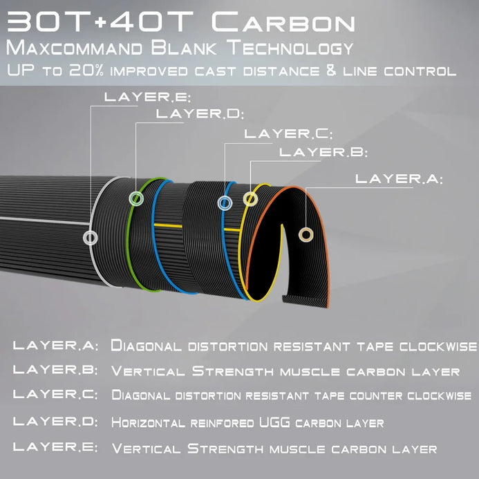 EXCLUSIVE MAXCOMMAND BLANK TECHNOLOGY- Pure 30T mixed 40T carbon fiber. With mixed 7 layers of carbon including Reinforced Muscle carbon layer for at least 25% increased casting performance. 11ft switch rod is perfect for small trout and smallmouth bass. And the Spey rod is great for  coho/lake trout/brown trout and steelhead.