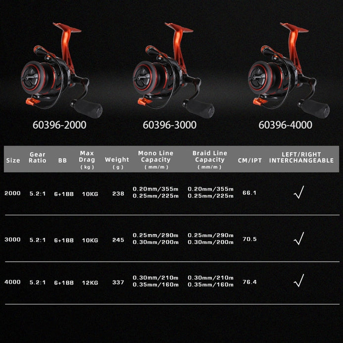 ● Function: 5.2:1 High-Speed Gear Ratio, three models (2000/3000/4000)can be chosen from, Left and right interchangeable aluminum handle, comfortable EVA handle grips.