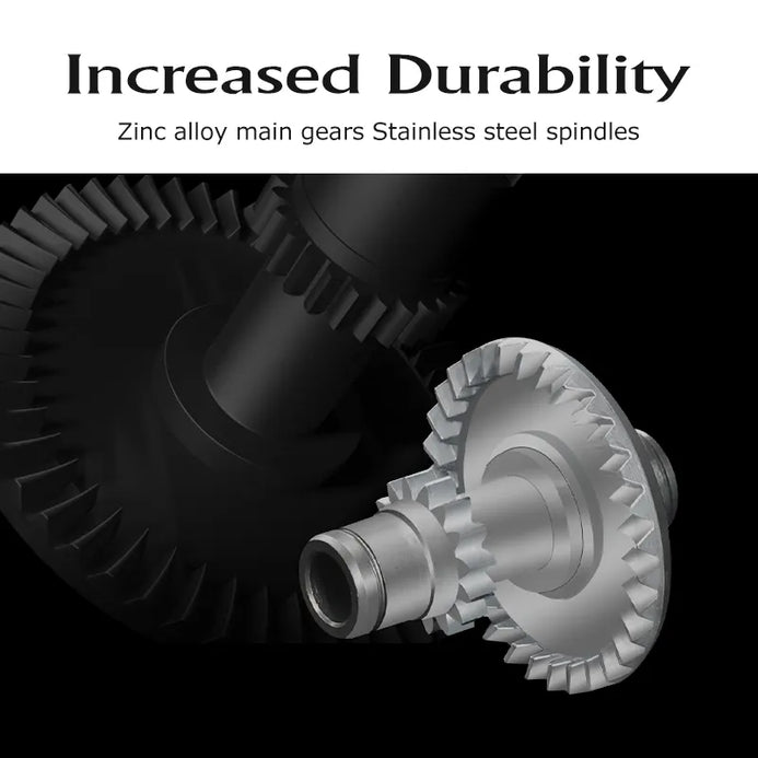 • Zinc alloy main gears and stainless steel spindles: corrosion resistance durability.