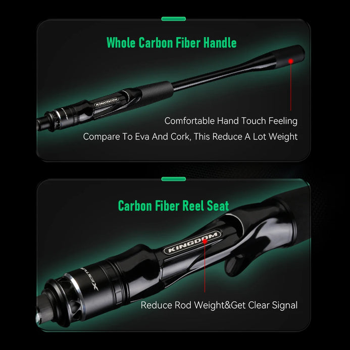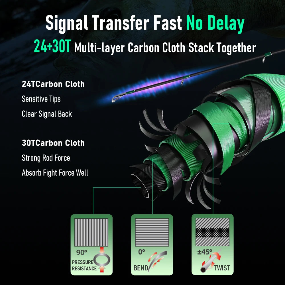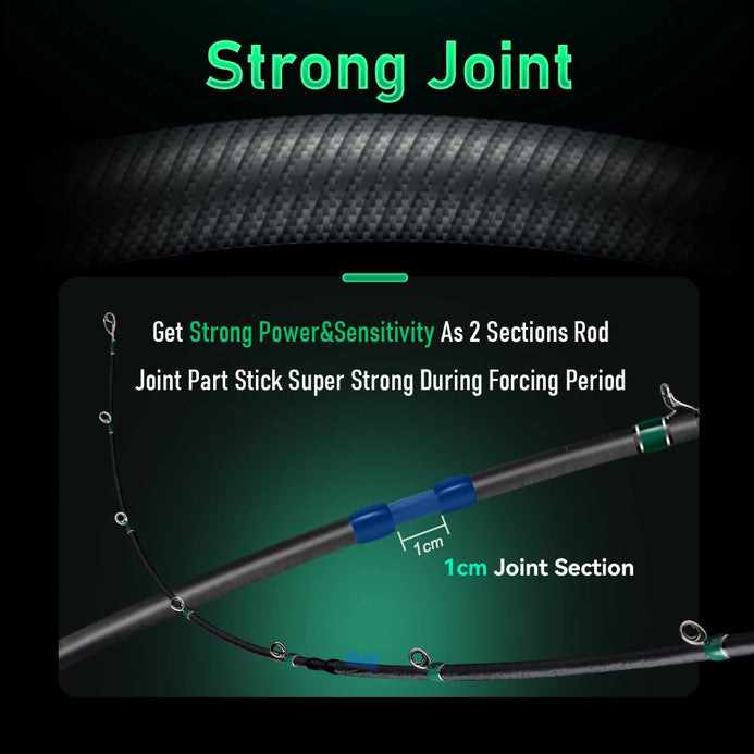 3. 24T+30T multi-layered carbon fabric cross-laminated for a highly sensitive tip, delivering a sharp bite like an electric shock! Its strong and resilient design allows for seamless fish control, making it incredibly easy to tackle giant fish!