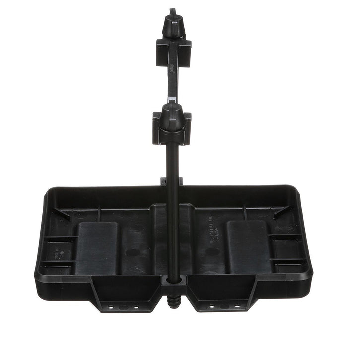 This battery tray is made of heavy-duty, non-corrosive black plastic. The tray includes an adjustable-height crossbar and two retaining bolts.