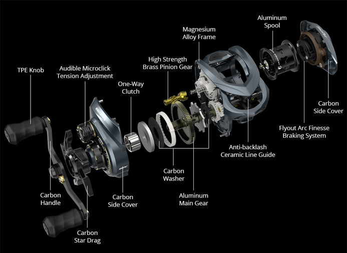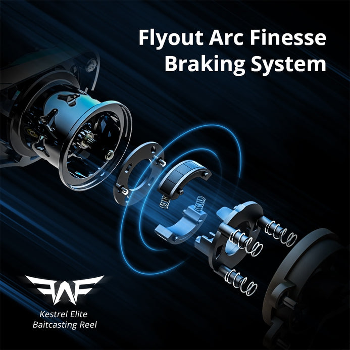 • ADVANCED BRAKING TECHNOLOGY- The FAF (Flyout Arc Finesse) Braking system was designed specifically for finesse fishing. Two half-ring magnetic brakes automatically adjust to slow down the spool when braking is needed to prevent backlashes. As the speed of the spool decreases, the magnetic field inside the spool diminishes and the magnets retract to maximize casting distance. There is also an external fingertip brake adjustment dial for fine tuning spool speeds for smaller baits.
