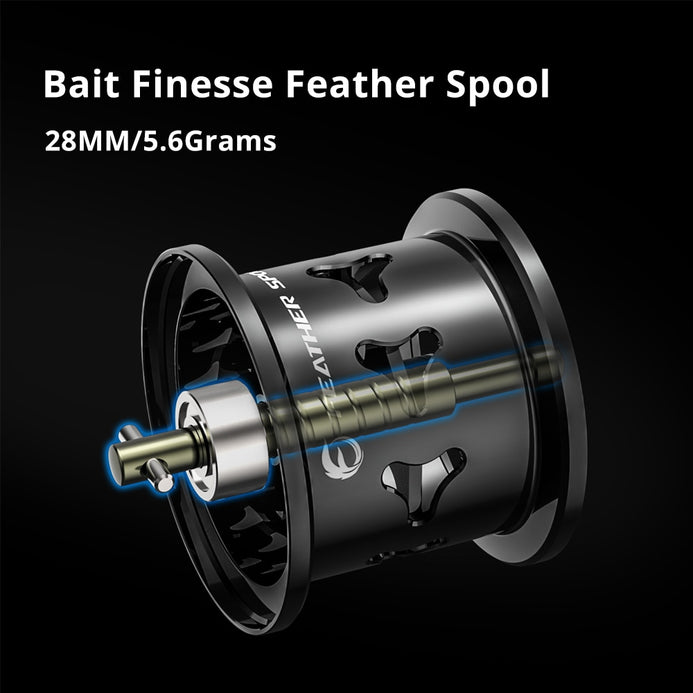• INNOVATIVE SPOOL - The ultra-lightweight BFS shallow feather spool weighs only 5.6 grams! The smaller spool excels at handling the smaller diameter lines best suited for finesse fishing. The shallow spool requires less effort to turn and get up to speed, therefore enabling anglers to effectively cast lures down to 1/16 oz.