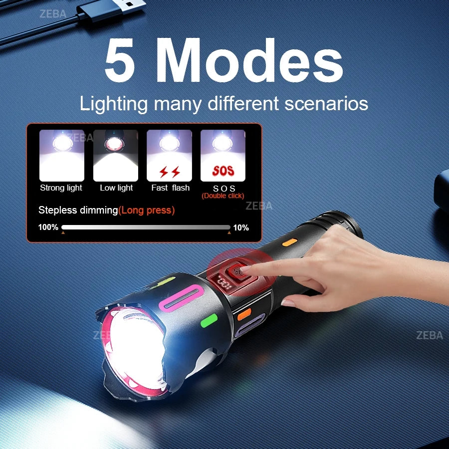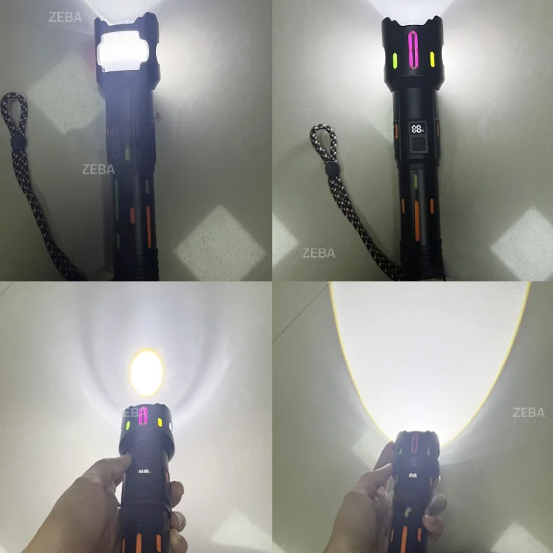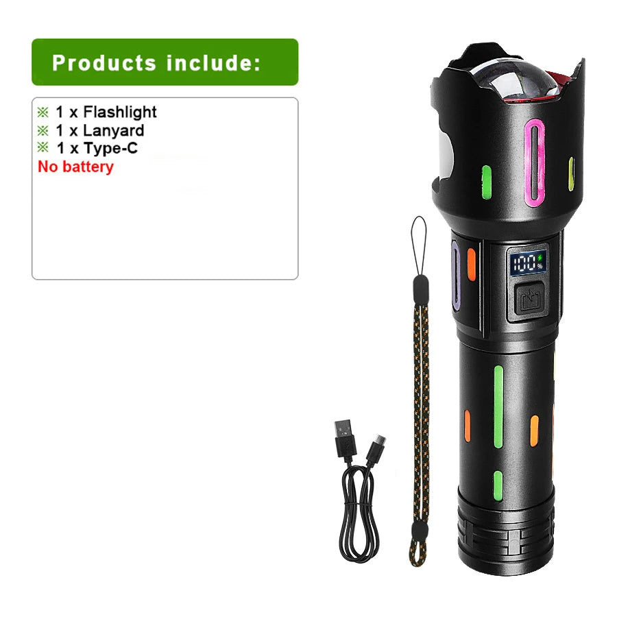 With the newly upgraded 900W LED powerful flashlight, we have made better optimizations in terms of brightness and usage time. The fuselage carries a fluorescent design, which is very novel and cool. This flashlight is very lightweight and easy to carry, has 5 modes, is suitable anywhere, and has a data power display that makes you a clear idea of the remaining power. Charge with a super fast C charger and double the fast charge. It is a little helper for the family and is also suitable for all kinds of outdoor activities.