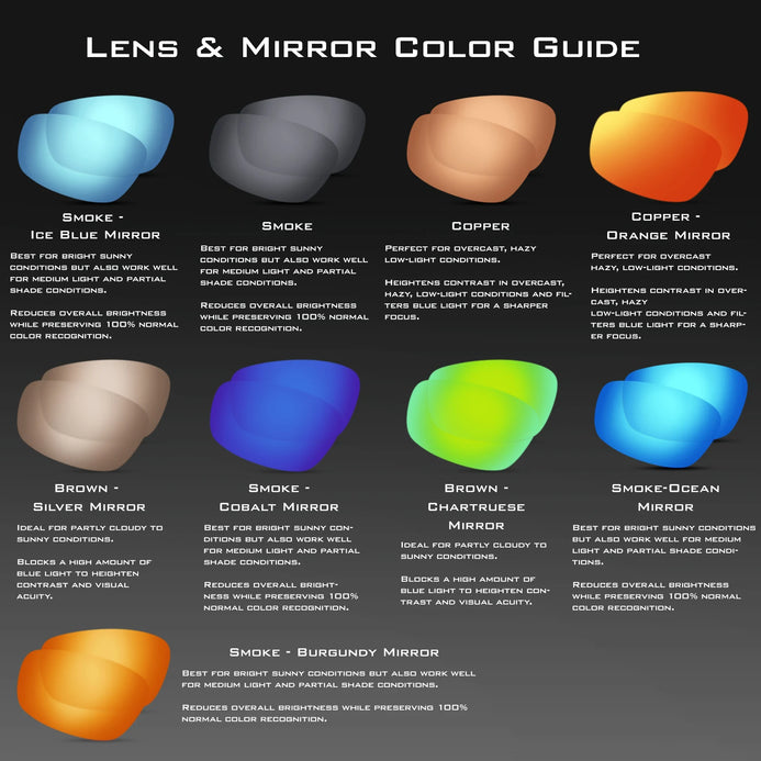 You can choose between smoke, brown, or copper base lens colors. Smoke lenses are ideal for bright sunlight and produce the most realistic color reproduction, but also work well in medium light and partial shade. Brown lenses increase contrast and depth perception, ideal for partly cloudy to sunny conditions. Copper lenses provide excellent contrast and depth perception, best suited for moderate to low light.