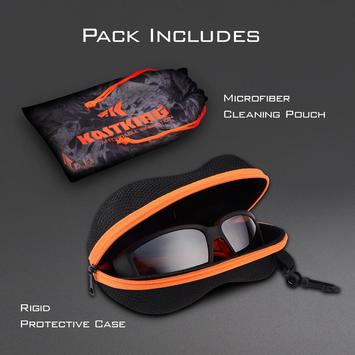 • PROTECT YOUR EYEWEAR – KastKing includes a molded custom hard case for storage and a custom Prym1 Camo microfiber pouch which can be used for cleaning as well as storing your sunglasses. To avoid lens scratches and lens coating damage, clean your lenses with a clean microfiber cloth or lint free cloths and fresh warm water. Never dip them in saltwater or dry with a paper towel.