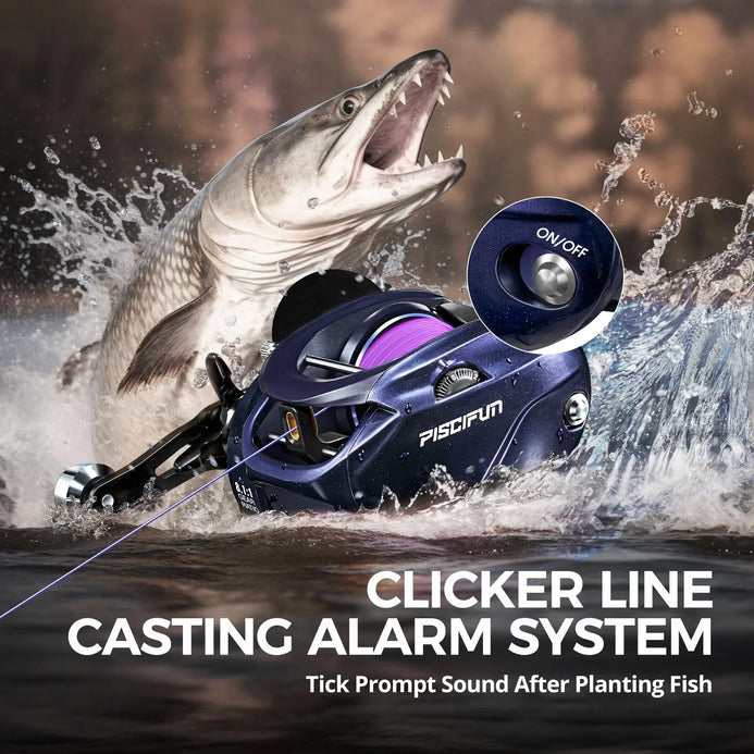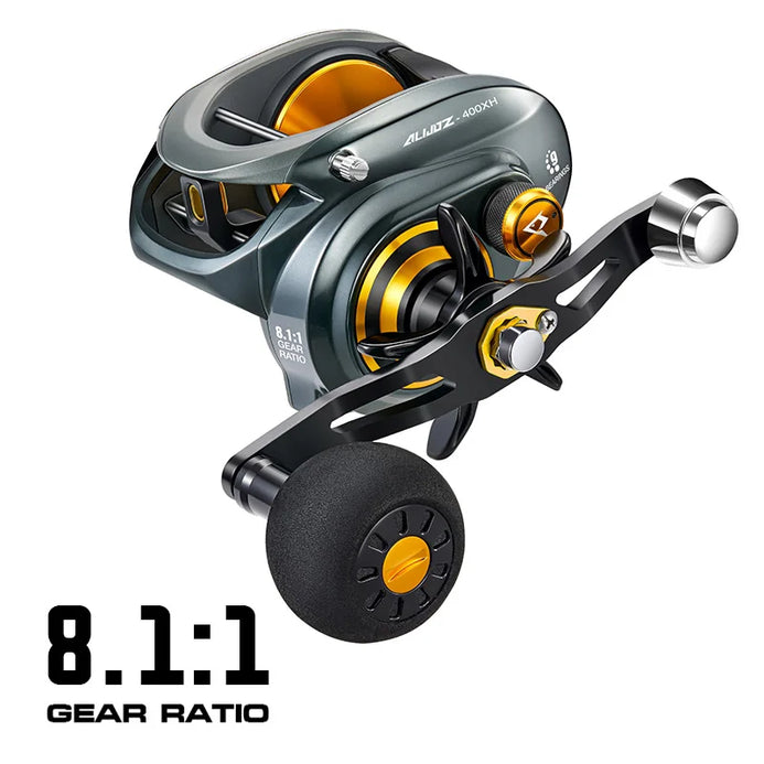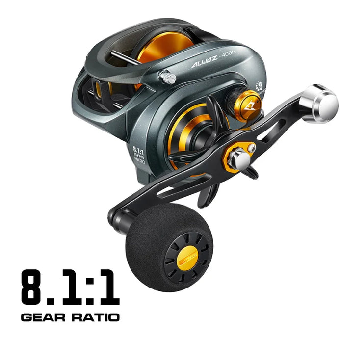 The Alijoz 400 is a heavy-duty, high-line capacity casting reel equipped with a Bait-Clicker Switch. It features a magnetic brake system that enables long-distance casting and has a maximum Drag Power of 17kg/38 LBS making it suitable for saltwater scenarios where large bait and big fish are targeted.