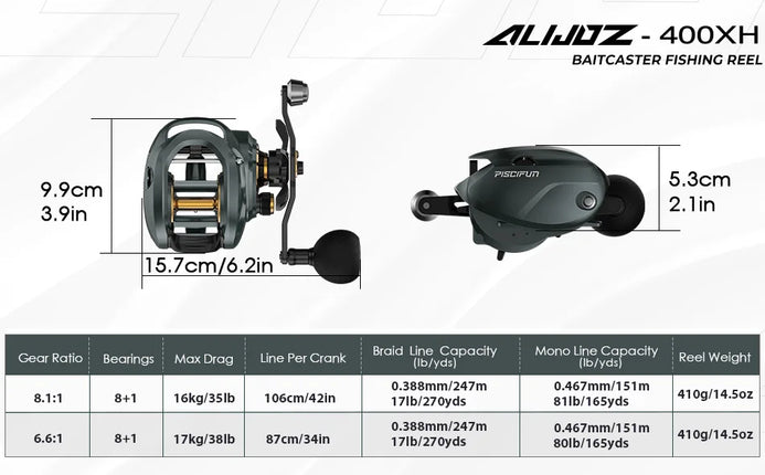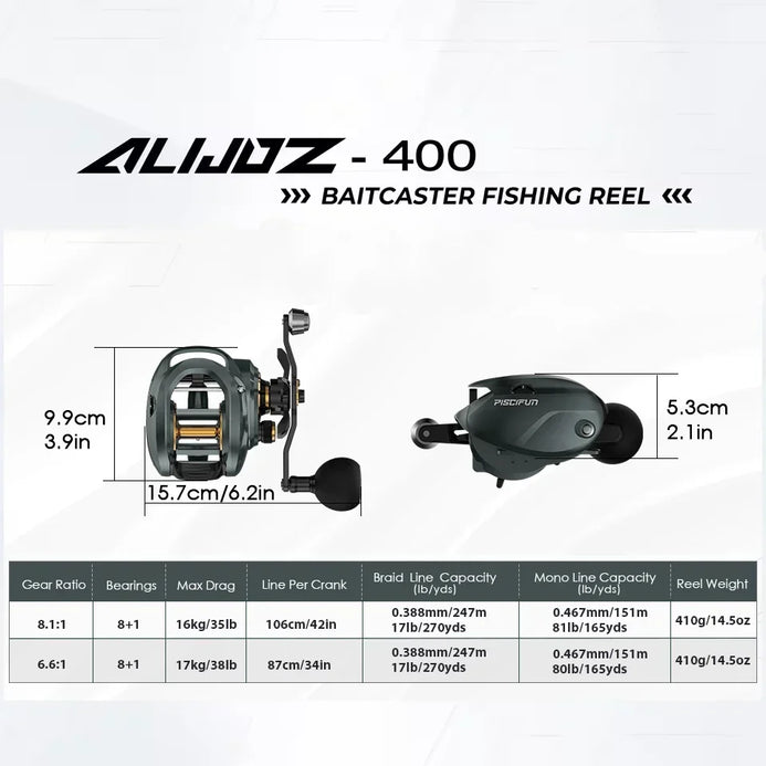 Piscifun Alijoz 400 Baitcaster 8+1BB 17Kg/38Lb Max Drag 8.1:1/6.6:1