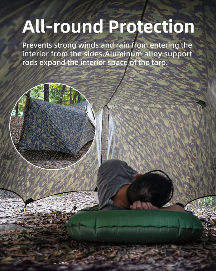 【Innovative Design】Enjoy unmatched versatility with our advanced aluminum alloy support poles, which maximize internal space and eliminate the need for cumbersome external ropes. Setting up is a breeze—just extend the poles to open the tarp, creating a spacious area for relaxation and socializing without the hassle of traditional setups.