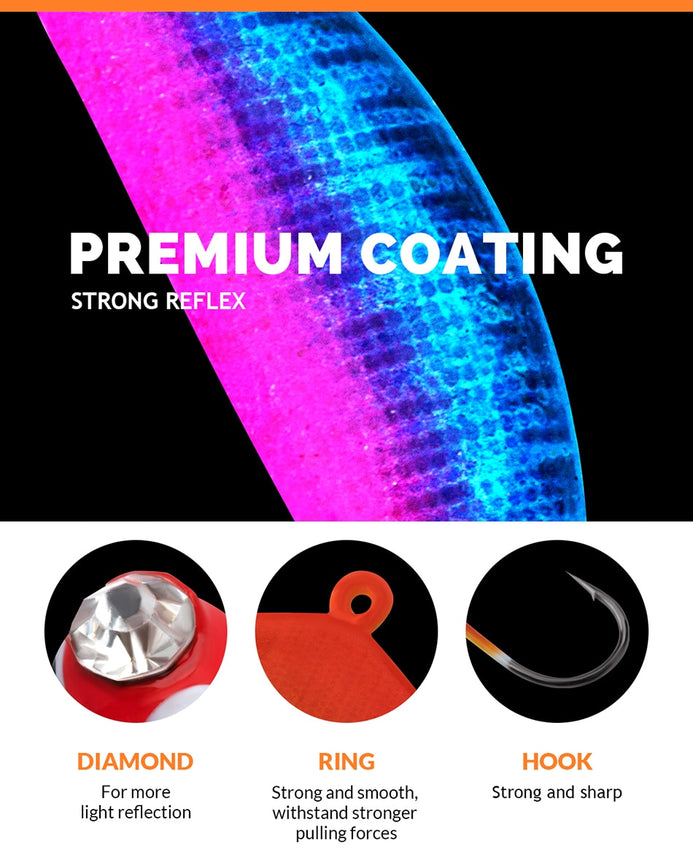 EFFICIENT ICE FISHING JIGS: Highly simulated ice fishing lures provide vivid swimming action. The diamond on the head of the ice jig which can reflected light, adding more attraction to these jigs.