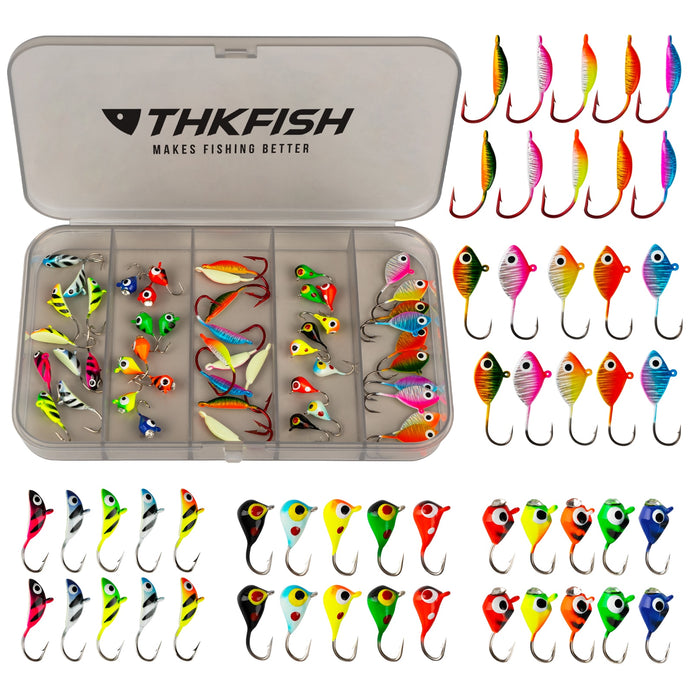 THKFISH 50pcs Ice Fishing Jig Hook Kit