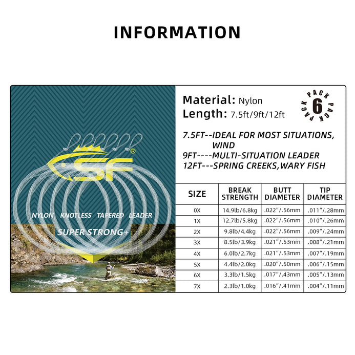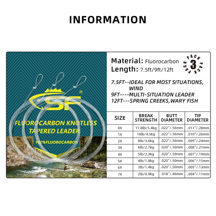 SF 3pcs/6pcs Nylon Tapered Fly Leader with Pre-tied Loop 7.5FT 9FT 12FT 0-7X