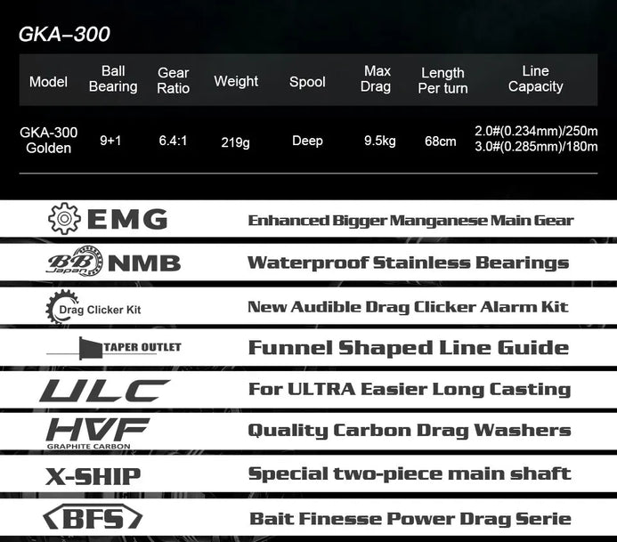 SoloKing GKA300 BFS Baitcasting Reel Single Handle 9.5KG Drag 9+1BB 6.4:1 Drag Clicker
