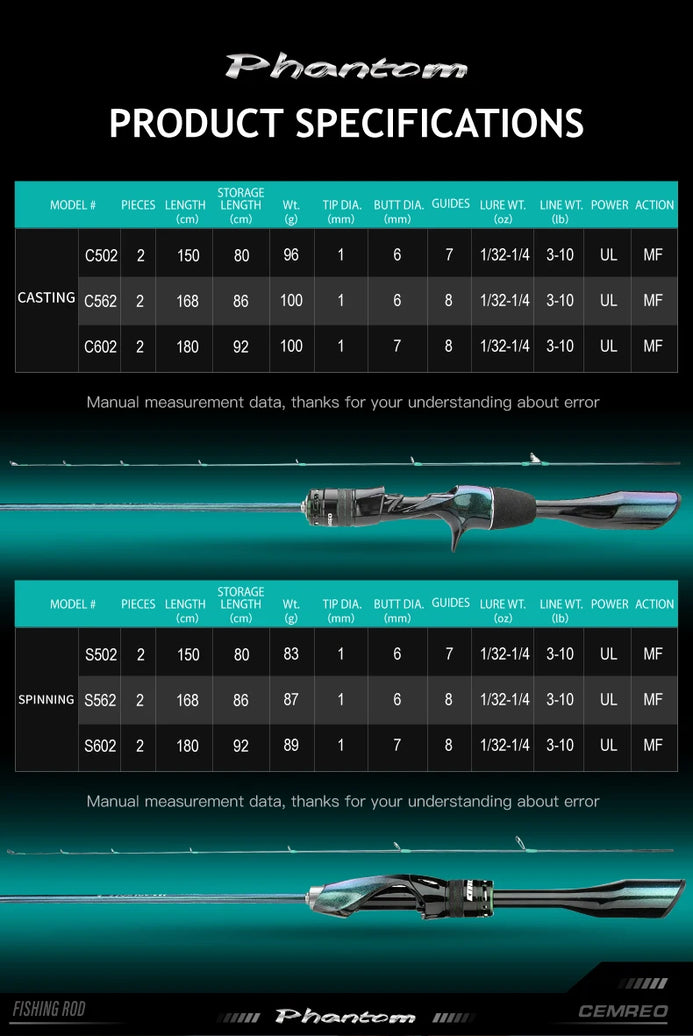 Cemreo PHANTOM Carbon Trout Casting/Spinning Rod 2PC UL MF
