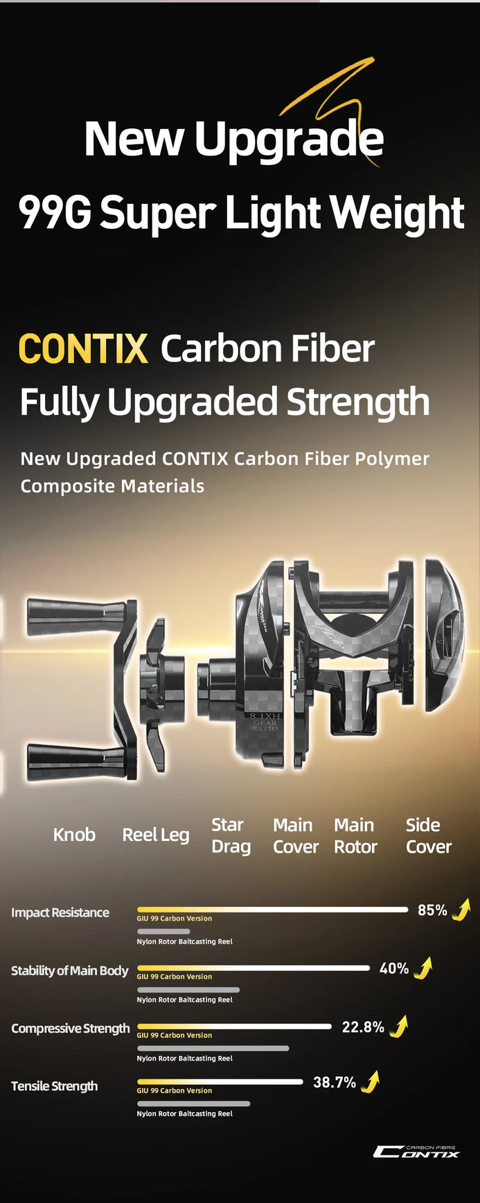 Upgraded CONTIX carbon fiber polymer composite construction | 99G ultra-lightweight design | Enhanced structural integrity with 30% increased tensile strength. |