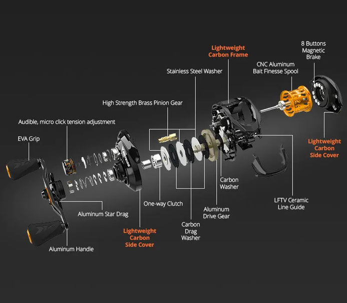 SMOOTHNESS WHERE IT COUNTS– Inside Zephyr’s carbon shell are 6 + 1 double shielded stainless steel ball bearings with super free-spooling spool bearings that allow the farthest casts with the lightest baits. Precision machined T7075 hardened aluminum alloy main gears and brass pinion gears, nickel plated brass worm shaft, and an 8-magnet braking system get the work done easily and without effort.