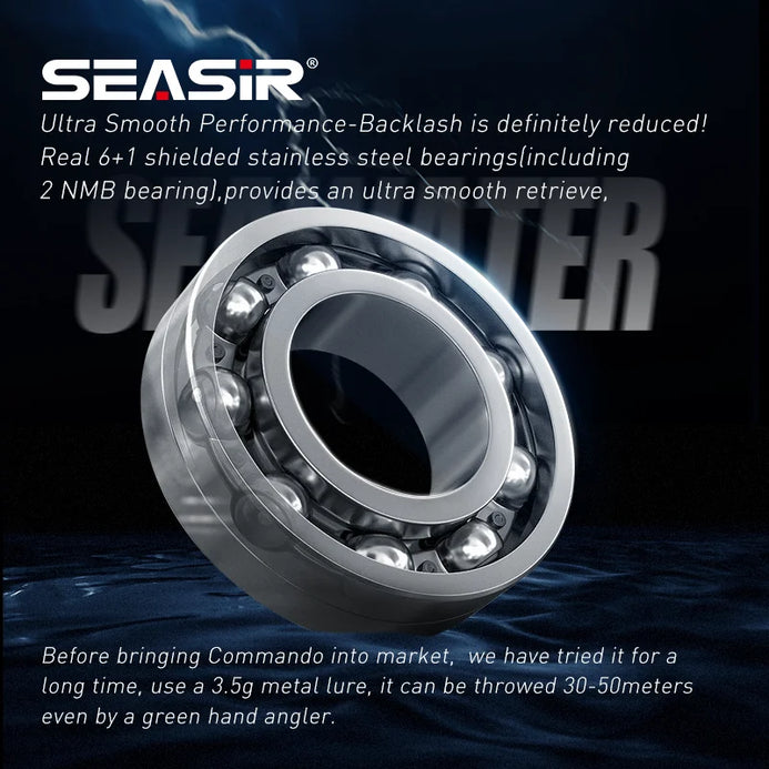 Real 6+1 shielded stainless steel bearings(including 2 NMB bearing),provides an ultra smooth retrieve, Before bringing Commando into market, we havetried it for a long time, use a 3.5g metal lure, it can be throwed 30-50meters even by a green hand angler.