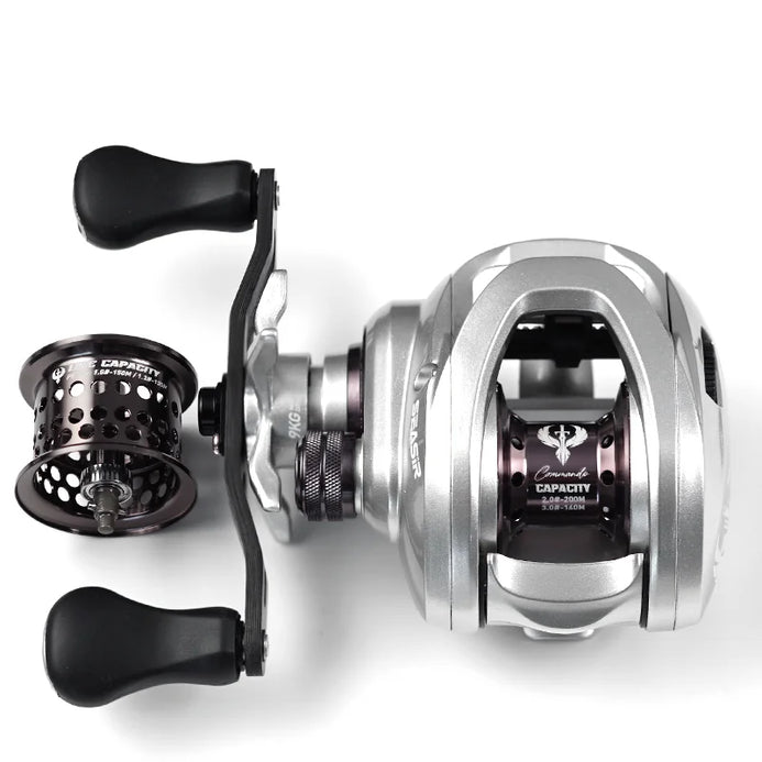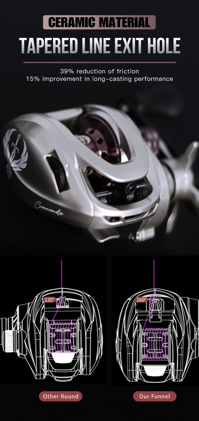 Commando has been designed and debugged for one year, a more compact design canextended product servicelife,Gear meshing and transmission are smoother and won't make noise, Smallergap means it won't stuck fishing line,Overall it's a Baitcasting reel that can fulfill all your demands,andcomfortable even after thousands of casts during a day of fishing.