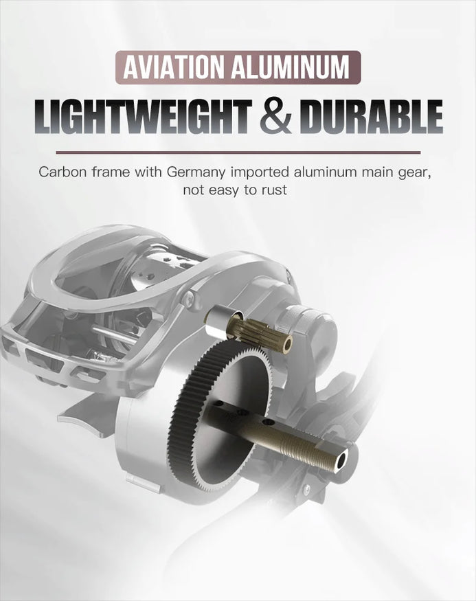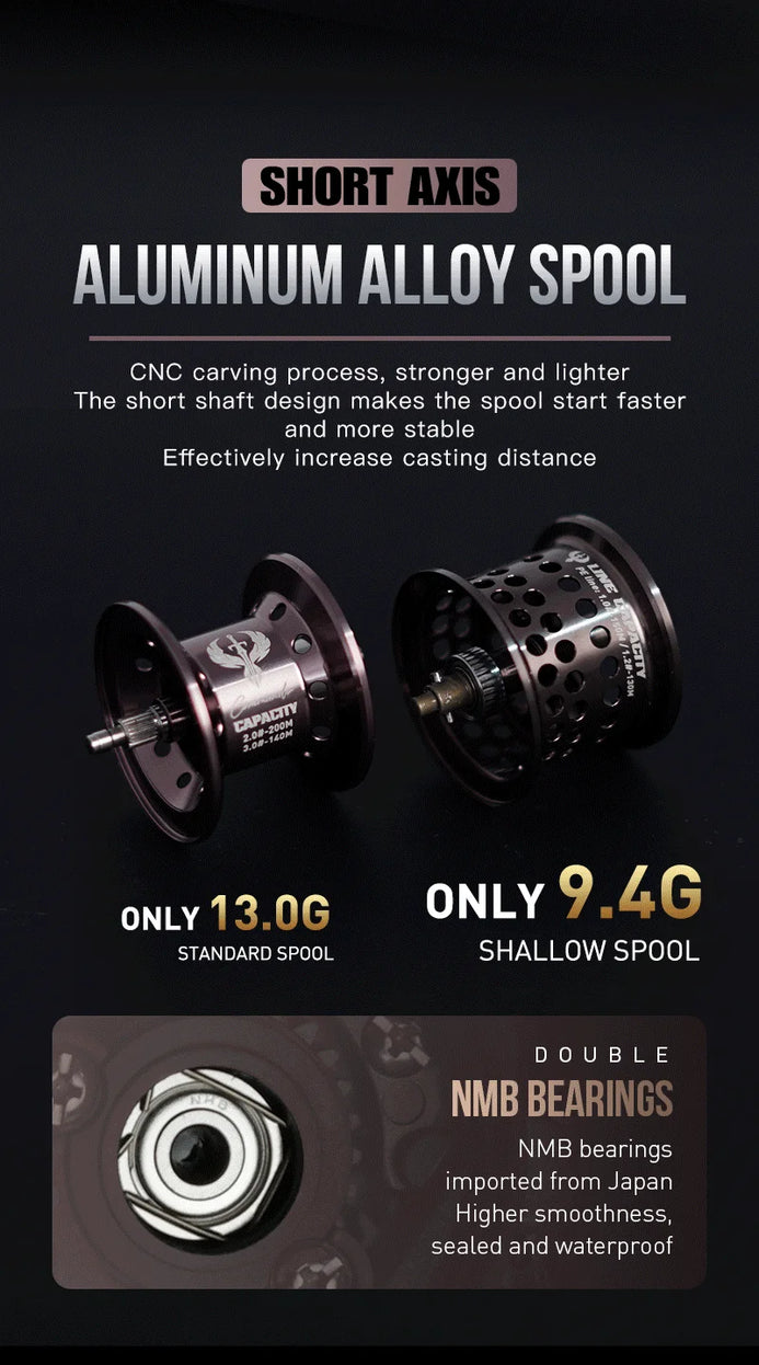 Excellent durabilityand Ultralight weight, not easyto rust,we ensure excellent durability,and try hard to reduce the reel weight to 168g with 9.4gshallow spool and 13g standard spool,endue angler with an extreme comfortable casting feeling.