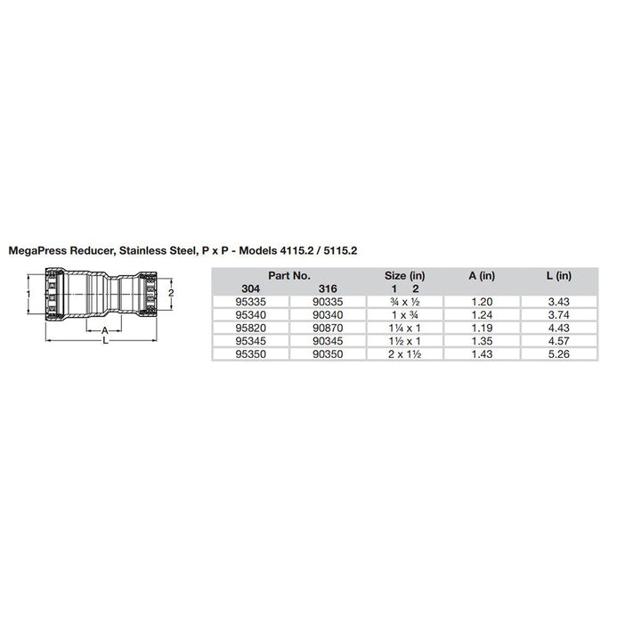 MegaPress 3/4" x 1/2" Stainless Steel 304 Reducer - Double Press Connection - Smart Connect Technology
