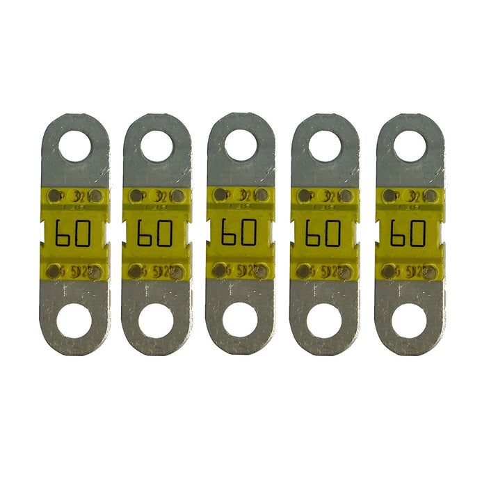 Victron Energy's MIDI fuses are essentially a smaller version of the MEGA fuses and are known to have low voltage drop and cold resistance. This particular pack of Victron MIDI fuses contains five 60-amp fuses.