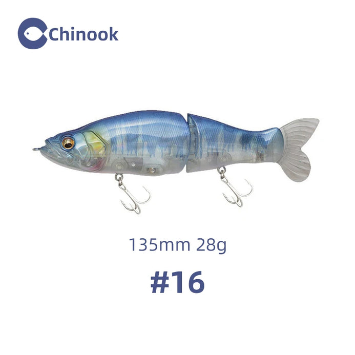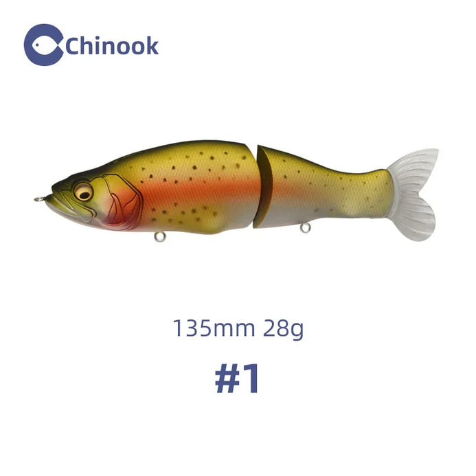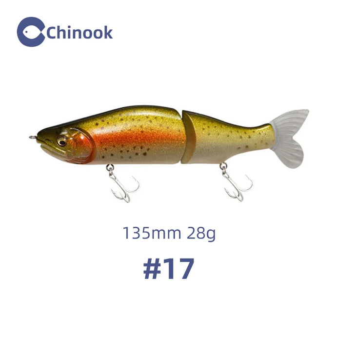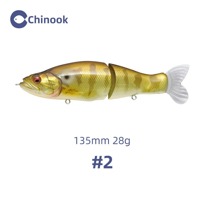 The Chinook Jointed Swimbait measures 135mm and weighs 28g, making it an ideal choice for anglers looking to catch bigger fish. This swimbait's jointed design adds a realistic touch to its swimming action, making it a great addition to any tackle box.
