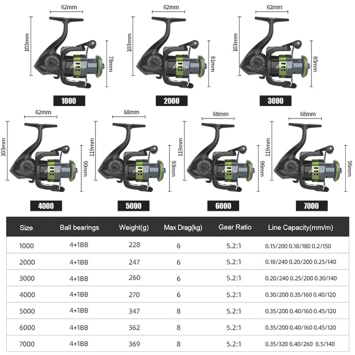 Reel Weight (1000/2000/3000/4000/5000/6000/7000): 210g/216g/280g/280g/382g/387g/388g