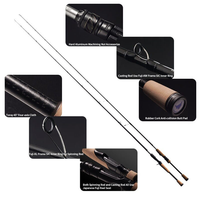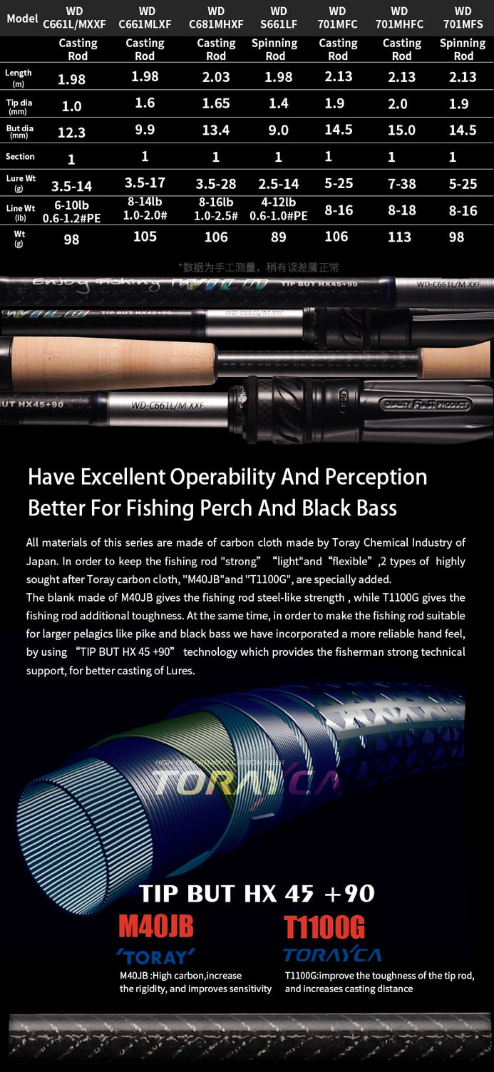 6. All materials of this series are made of carbon cloth made by Toray Chemical Industry of Japan. In order to keep the fishing rod "strong”“light"and“flexible”,besides the basic Toray carbon cloth, "M40JB"and "T1100G", two highly sought-after carbon cloths, are specially added. The blank made of M40JB can make the fishing rod with enough steel, while T1100G can make the fishing rod with full toughness. At the same time, in order to make the fishing rod of the fishing of perch and black bass series have a more reliable hand feel, the “TIP BUT HX 45 +90” technology provides strong technical support, so that players can better enjoy the fun of Lure.