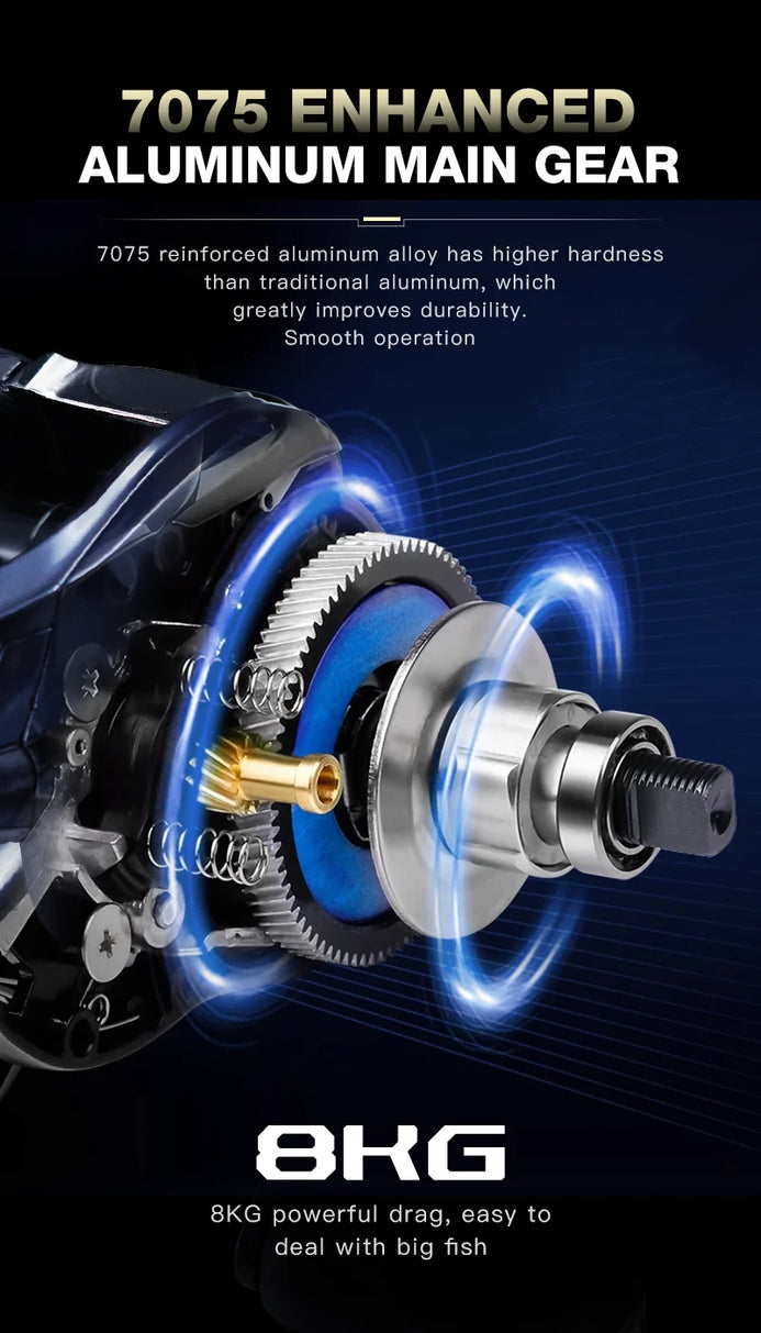 7075 Reinforced Aluminum Alloy Has Higher HardnessThan Traditional Aluminum, WhichGreatly Improves Durability.Smooth Operation,And 8kg Powerful Drag Is Easy To Deal With Big Fish