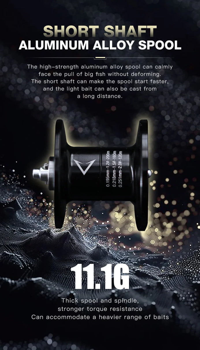 The High-Strength Aluminum Alloy Spool Can Calmly Face The Pull Of Big Fish Without Deforming.The Short Shaft Can Make The Spool Start Faster, And The Light Bait Can Also Be Cast From a Long Distance.Thereamong Thick Spool And Spindle, Stronger Torque Resistance Can Accommodate a Heavier Range Of Baits