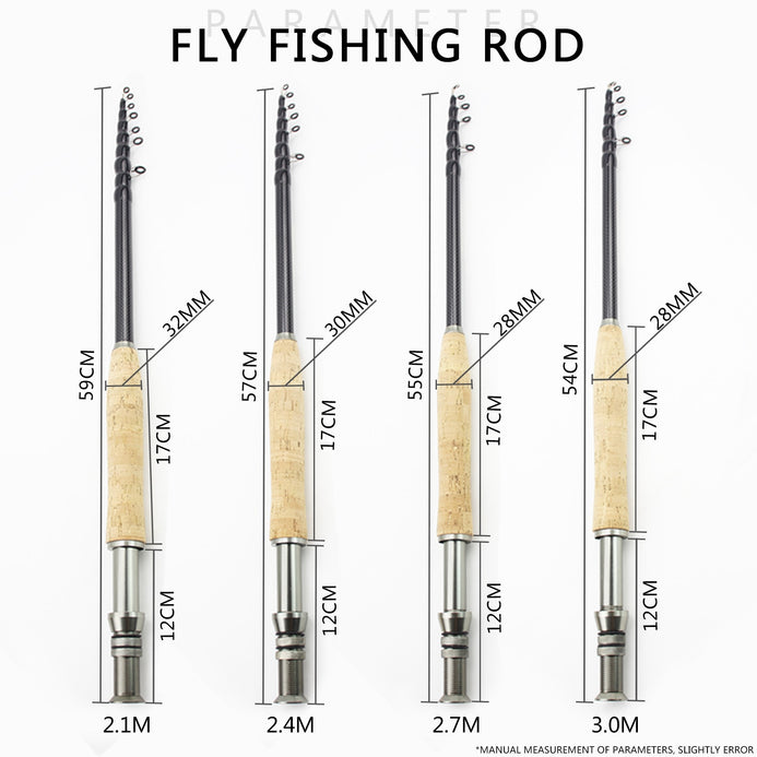 2. The medium-hard fly fishing rods are 2.1 meters, 2.4 meters, 2.7 meters, and 3.0 meters in length. The rods are light in weight and won't feel tired after being swung for a long time. The medium-hard design can be used to catch small fish or big fish. Perch, catfish, mandarin fish, pike, Northern Pike Etc. can be used.