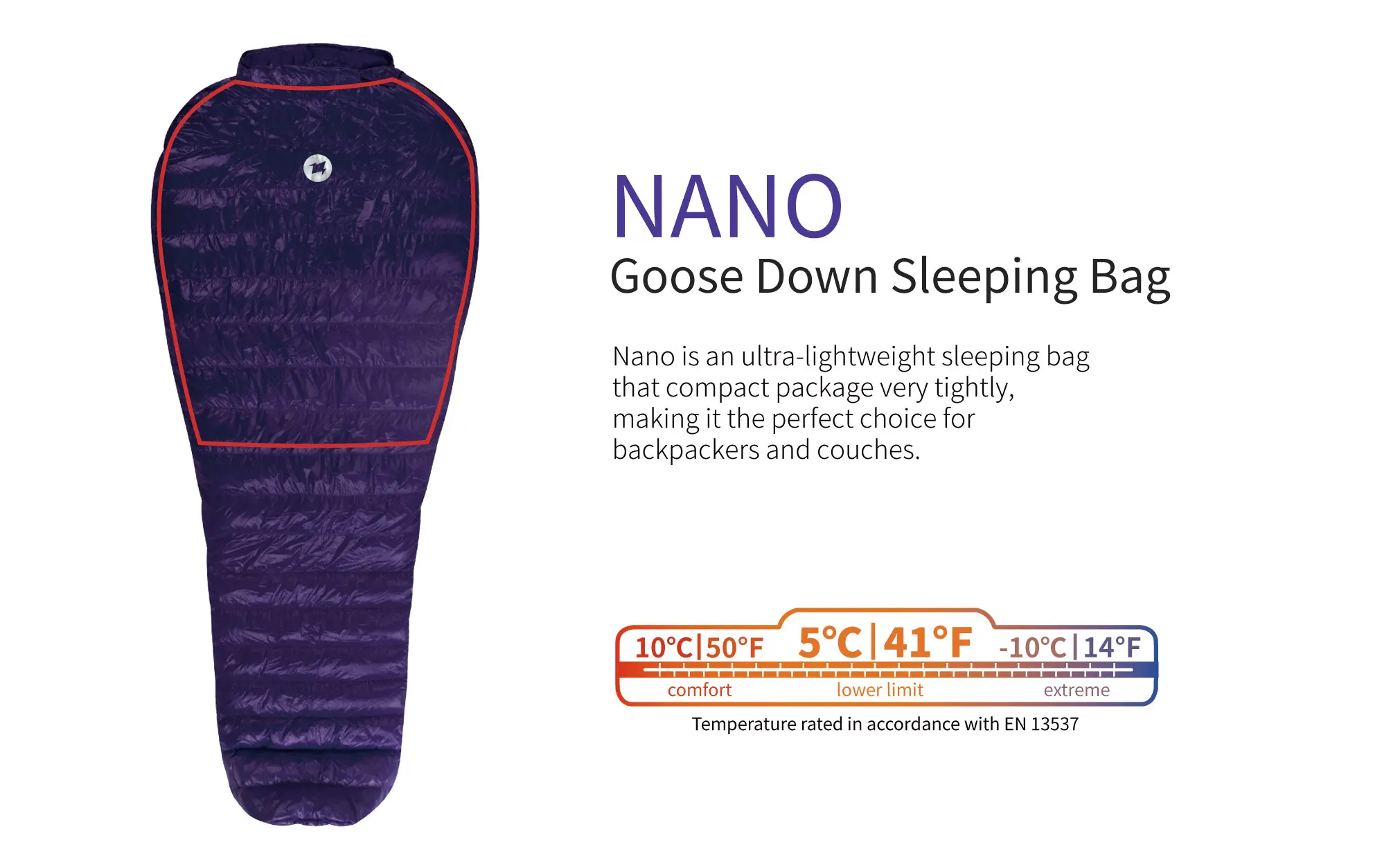 NANO-Lengthen :Fill weight:280g | Sleeping bagweight:574g | Total weight:612g | Size:200x86cm | Package:13x22cm.