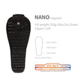 NANO-Regular :Fill weight:250g | Sleeping bag weight:506g | Total weight:544g | Size:180X78cm | Package:13x22cm.