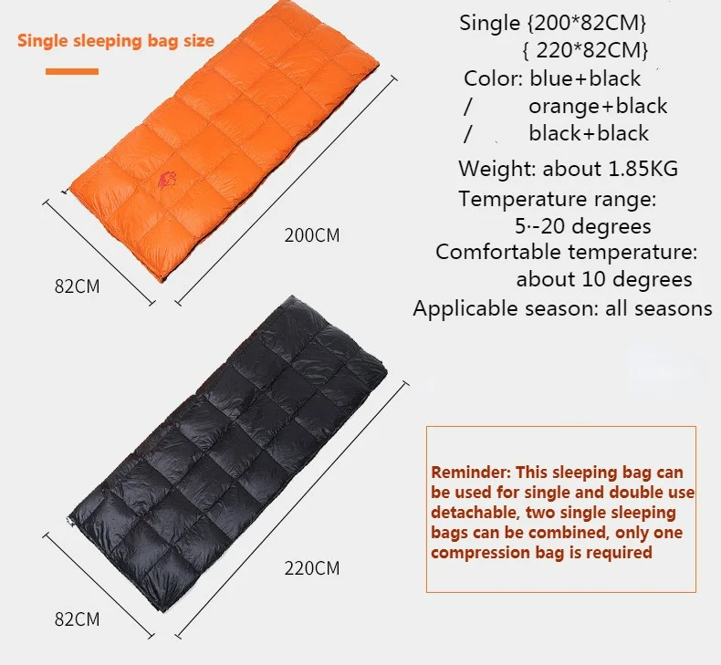 Reminder: This sleeping bag can be used by single person and double, detachable, two single sleeping bags can be used in combination, only one compression bag is needed