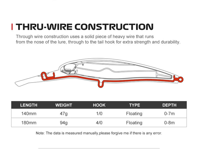 Through wire construction uses a solid piece of heavy wire that runs from the nose of the lure, through to the tail hook for extra strength and durability.