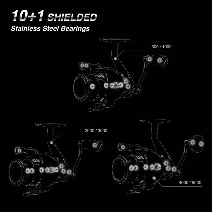 Smooth & Consistent - Double shielded 10+1 stainless steel bearings provide incredible smoothness for the Viper X fishing spinning reels. The reinforced stainless steel main shaft and Zinc alloy drive gear paired with carbon washers give you smoother and more consistent performance, no more stuck or line breaking.
