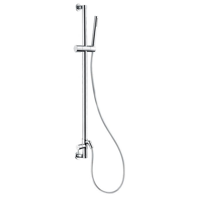 This unique sliding rail shower system combines a 28-inch-long shower rail with an integrated mixer, hose, and shower handle all in one. Installation requires the hot and cold water supplies to be connected to the top and bottom mounting system of the rail.